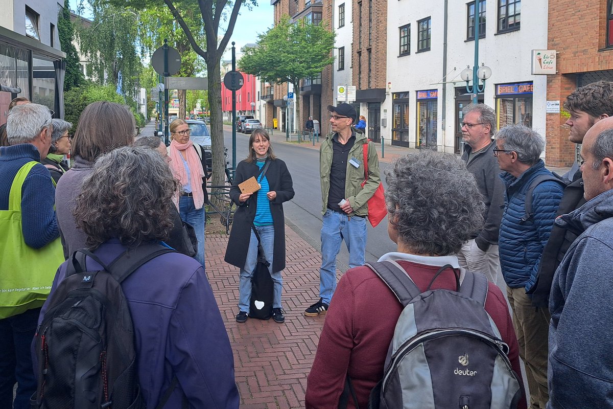 Im Rahmen der Entwicklung Bonner Klimaviertel fand ein Spaziergang durch das Klimaviertel Beuel statt. Etwa 21 interessierte Bürger*innen und Vertreter*innen verschiedener Partnerprojekte nahmen teil. Gemeinsam erkundeten sie die Vielfalt an Ideen, Projekten und Akteur*innen rund um das Thema Klimaschutz im Quartier.