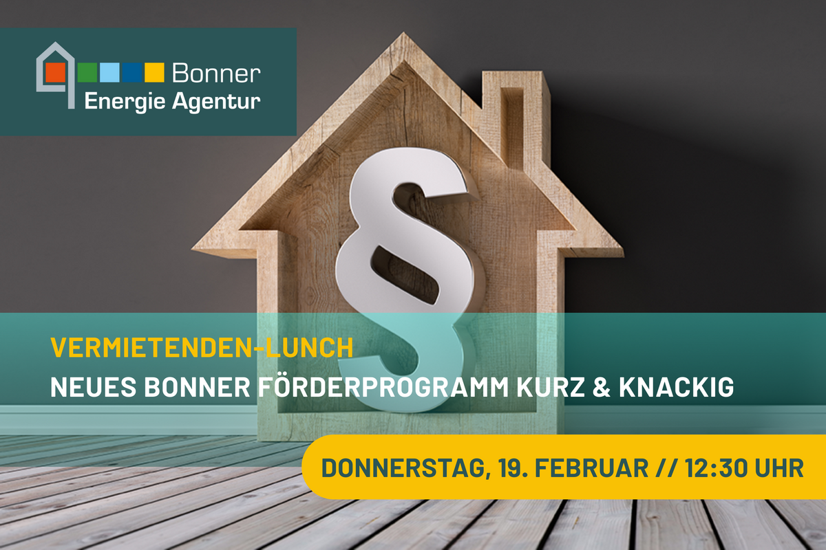 Die energetische Sanierung von Gebäuden ist ein zentraler Baustein der Wärmewende. Ein großer Teil der Mietswohnungen in Bonn liegt in privater Hand. Die Stadt Bonn hat das „Förderprogramm für die sozialverträgliche Bestandssanierung“ ins Leben gerufen, um Anreize für die Sanierung von privat vermieteten Wohngebäuden zu schaffen. Sind Sie Eigentümer*innen eines privat vermieteten Wohngebäudes oder einer Wohnung oder Teil einer Genossenschaft? Dann gehören Sie zur Zielgruppe des Förderprogramms. In dem Online-Vortrag erfahren Sie, ob und wie Sie als Vermieter*innen als auch Ihre Mieter*innen von der Förderung profitieren können.
